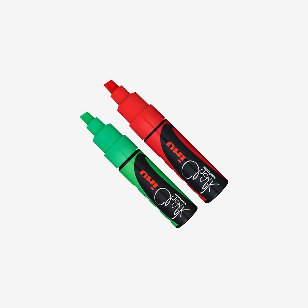 Marker koji piše po raznim površinama, uključujući staklo, plastiku i crne table. Mastilo je bez rastvarača i alkohola, a trag se lako uklanja vlažnom krpom. Debljina linije ispisa: 8 mm.