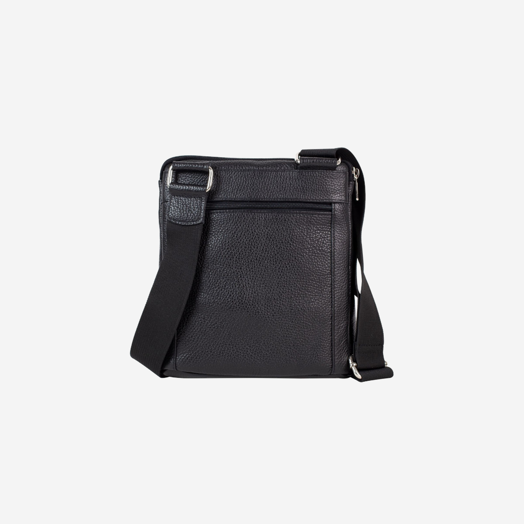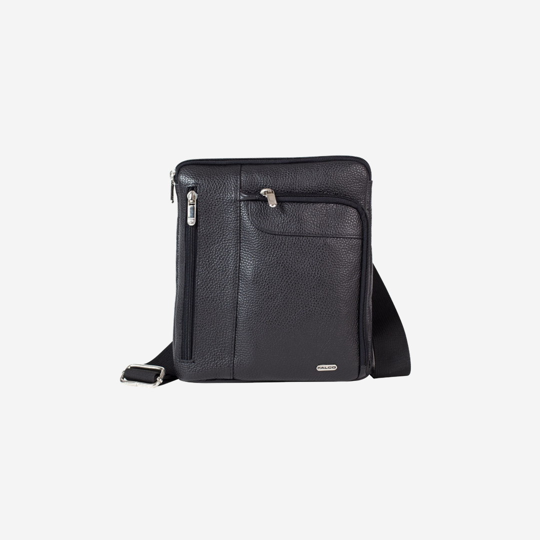 Biznis muška torbica izrađena od kvalitetne prirodne kože u crnoj boji. Ima praktičnu unutrašnjost sa dva komotna džepa. Sa spoljne strane se nalaze dva džepa sa cipom, kao i džep sa cipom sa zadnje strane. Ima dugački podesivi grif. Izgled torbice je upotpunjen metalnom pločicom Falco.
