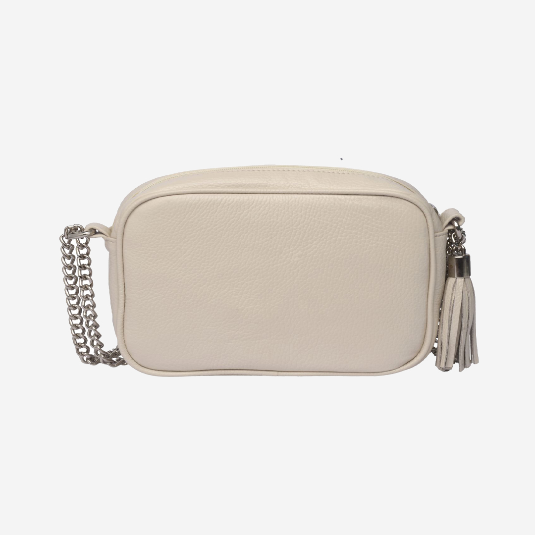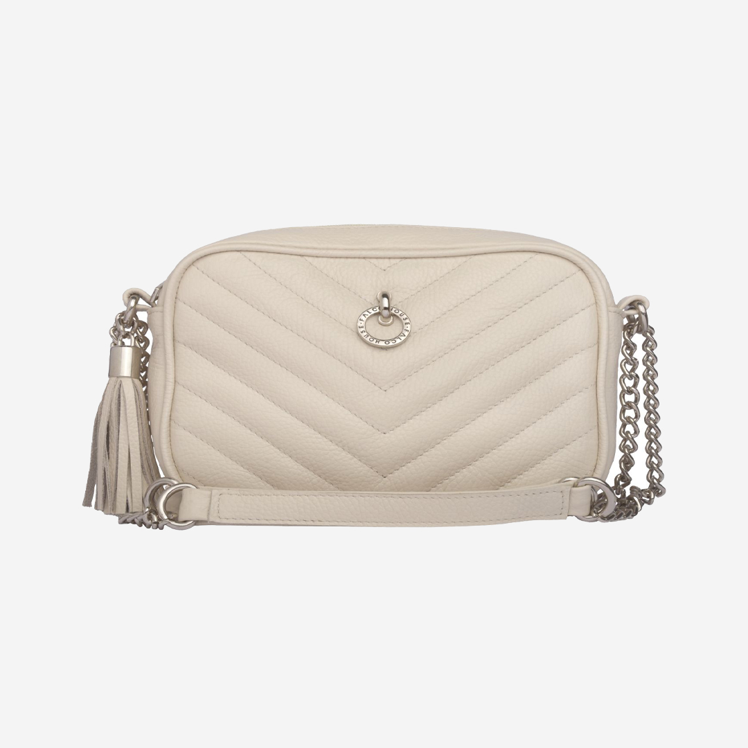 Štepana tašna izrađena od kvalitetne prirodne kože. Veoma je praktična, sa dovoljno mesta za najosnovnije. Ima dugačak metalni lanac sa kožnim dodatkom za ugodno nošenje. Lanac je podesiv na dve veličine. Izgled tašne je upotpunjen metalnom brendiranom alkom Falco.