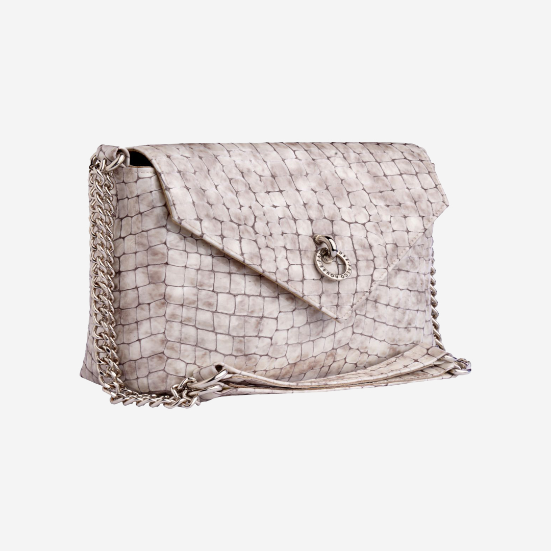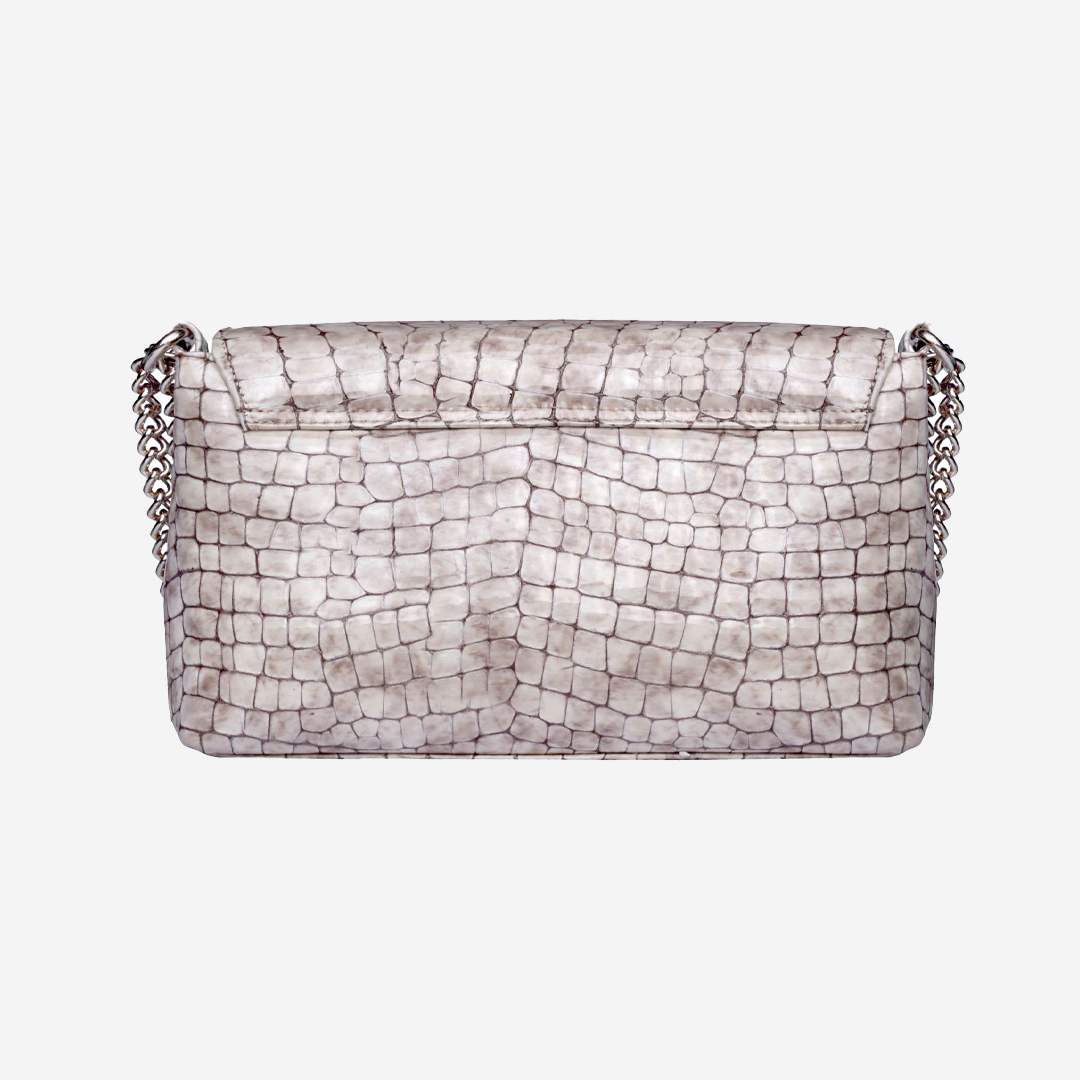 Trendy ženska tašna izrađena od kvalitetne prirodne kože. Unutrašnjost je veoma je praktična sa velikom pregradom i džepom. Ima dugačak metalni lanac sa kožnim dodatkom za ugodno nošenje. Lanac je podesiv na dve veličine. Izgled tašne je upotpunjen metalnom brendiranom alkom Falco.