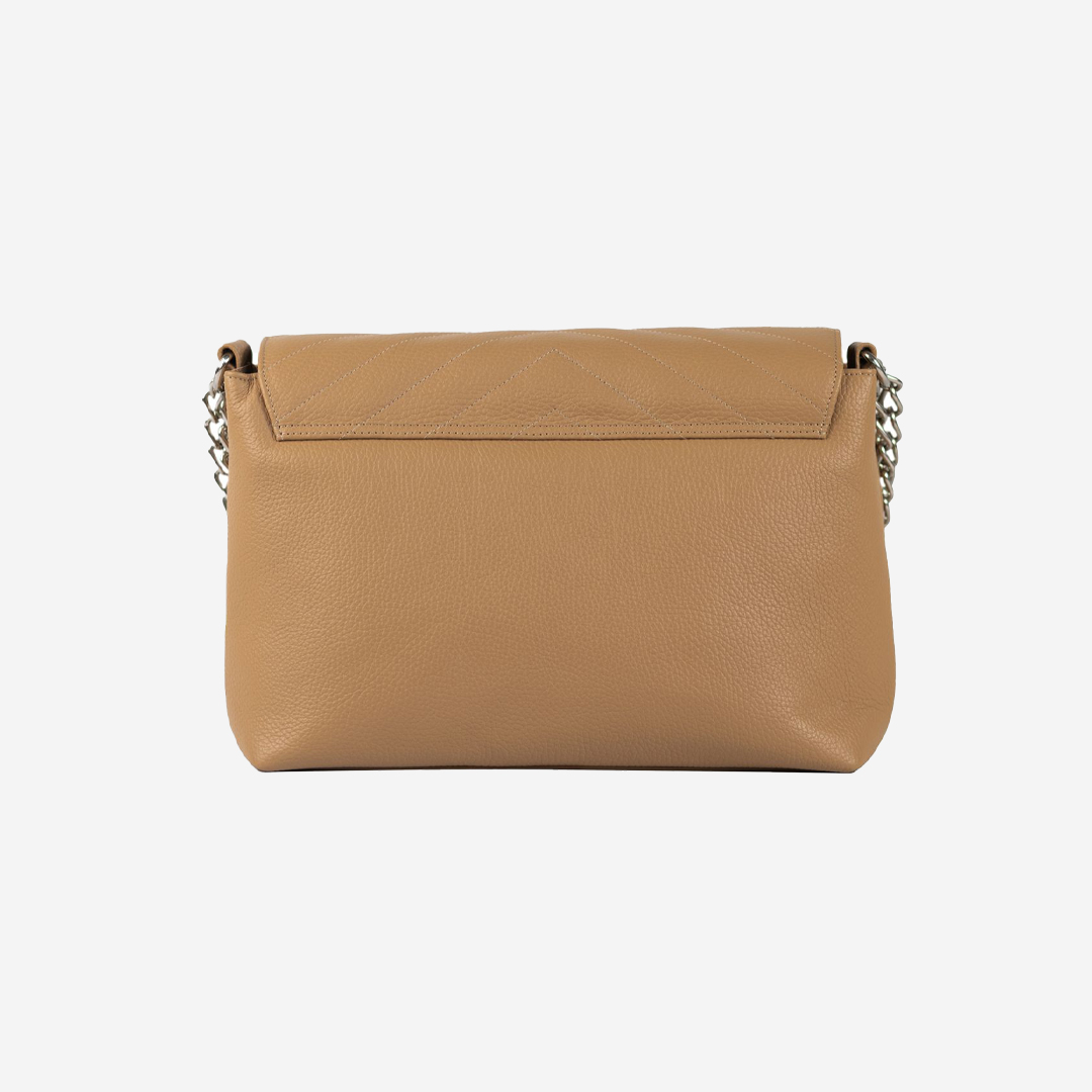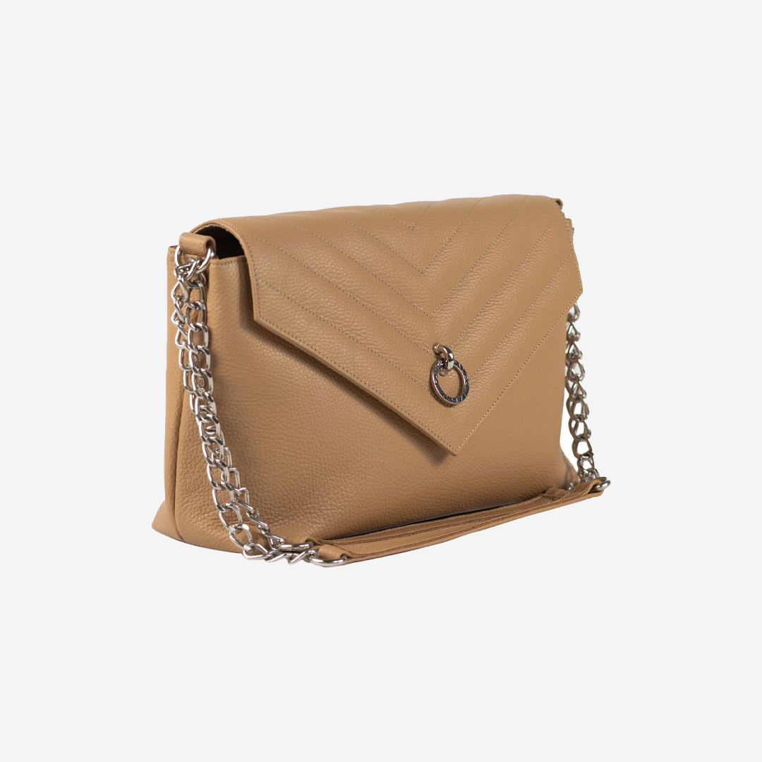 Trendy ženska tašna izrađena od kvalitetne prirodne kože. Unutrašnjost je veoma je praktična sa velikom pregradom i džepom. Ima dugačak metalni lanac sa kožnim dodatkom za ugodno nošenje. Lanac je podesiv na dve veličine. Izgled tašne je upotpunjen metalnom brendiranom alkom Falco.