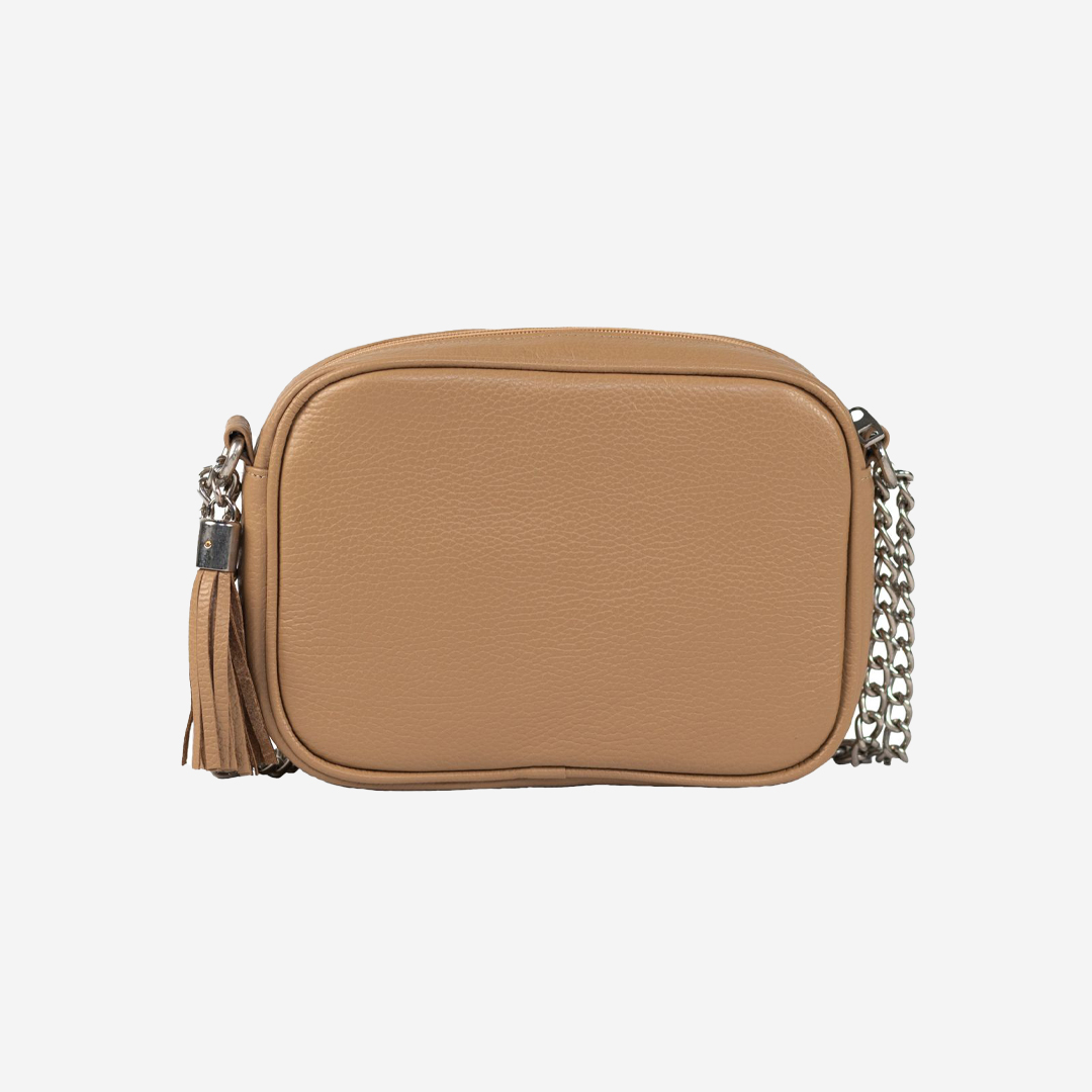 Štepana tašna izrađena od kvalitetne prirodne kože. Veoma je praktična, sa dovoljno mesta za najosnovnije. Ima dugačak metalni lanac sa kožnim dodatkom za ugodno nošenje. Lanac je podesiv na dve veličine. Izgled tašne je upotpunjen metalnom brendiranom alkom Falco.