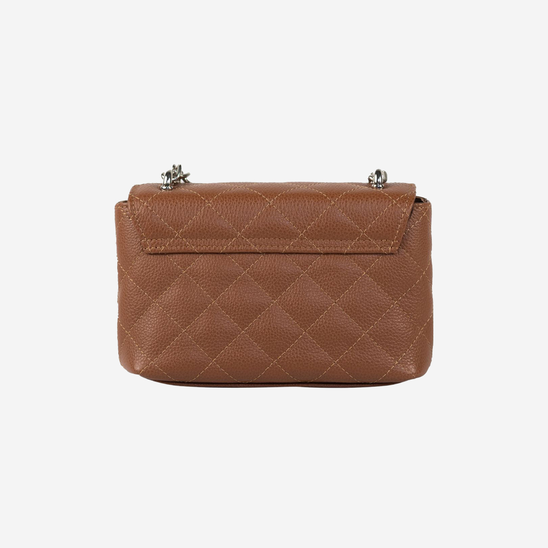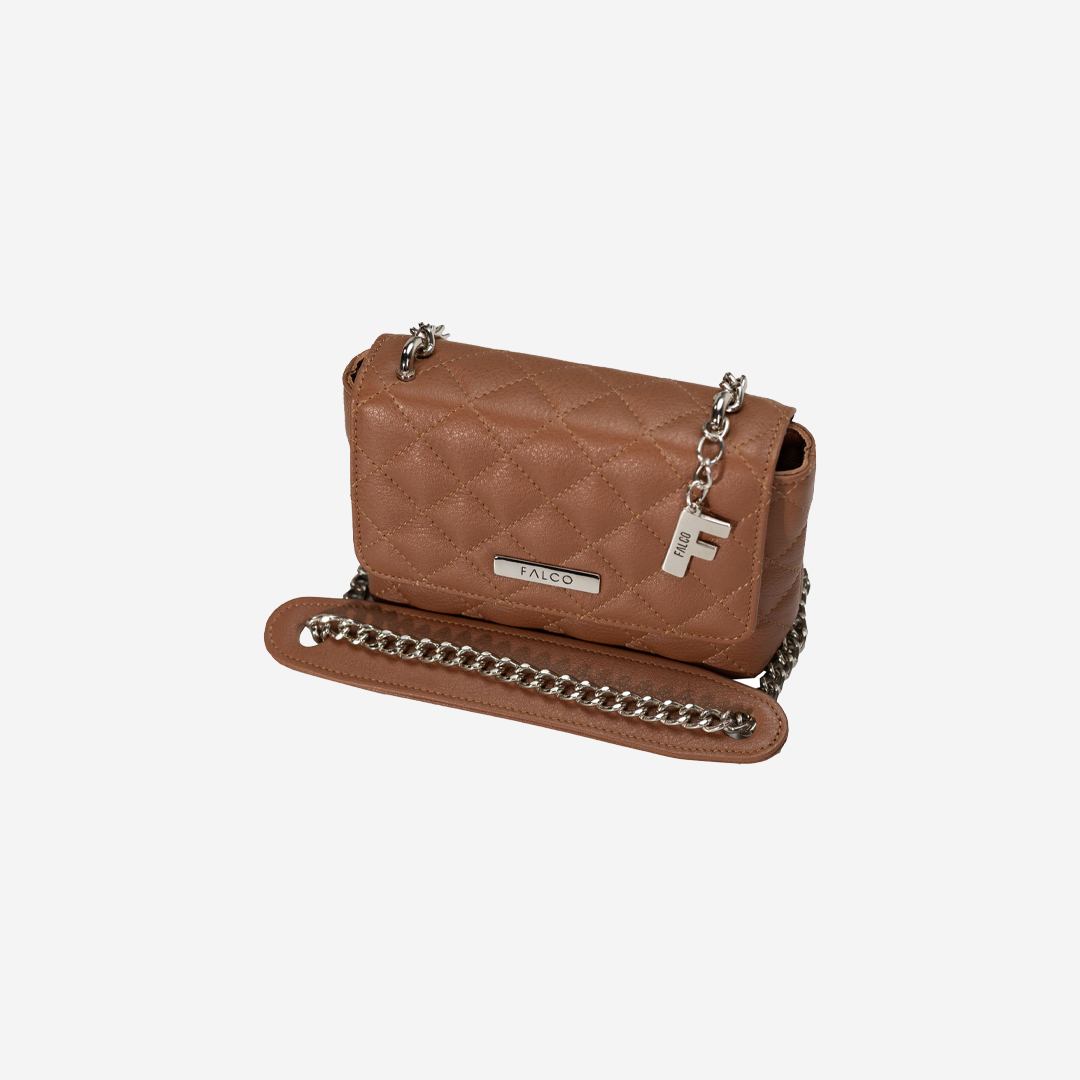 Štepana tašna izrađena od kvalitetne prirodne kože. Veoma je praktična, sa dovoljno mesta za najosnovnije. Ima dugačak metalni lanac sa kožnim dodatkom za ugodno nošenje. Izgled tašne je upotpunjen metalnom brendiranom alkom Falco.