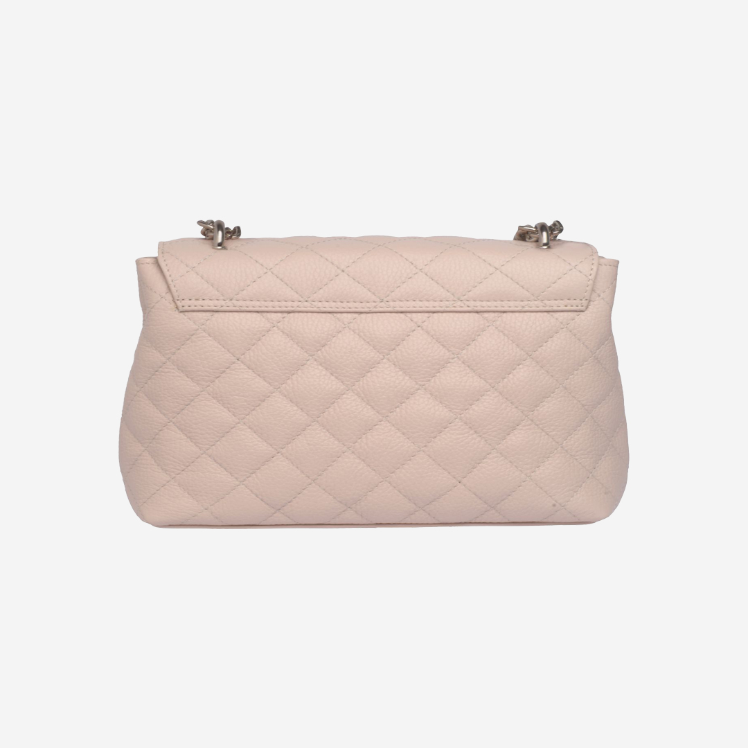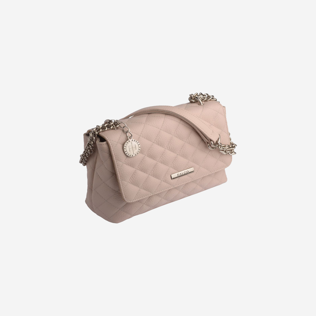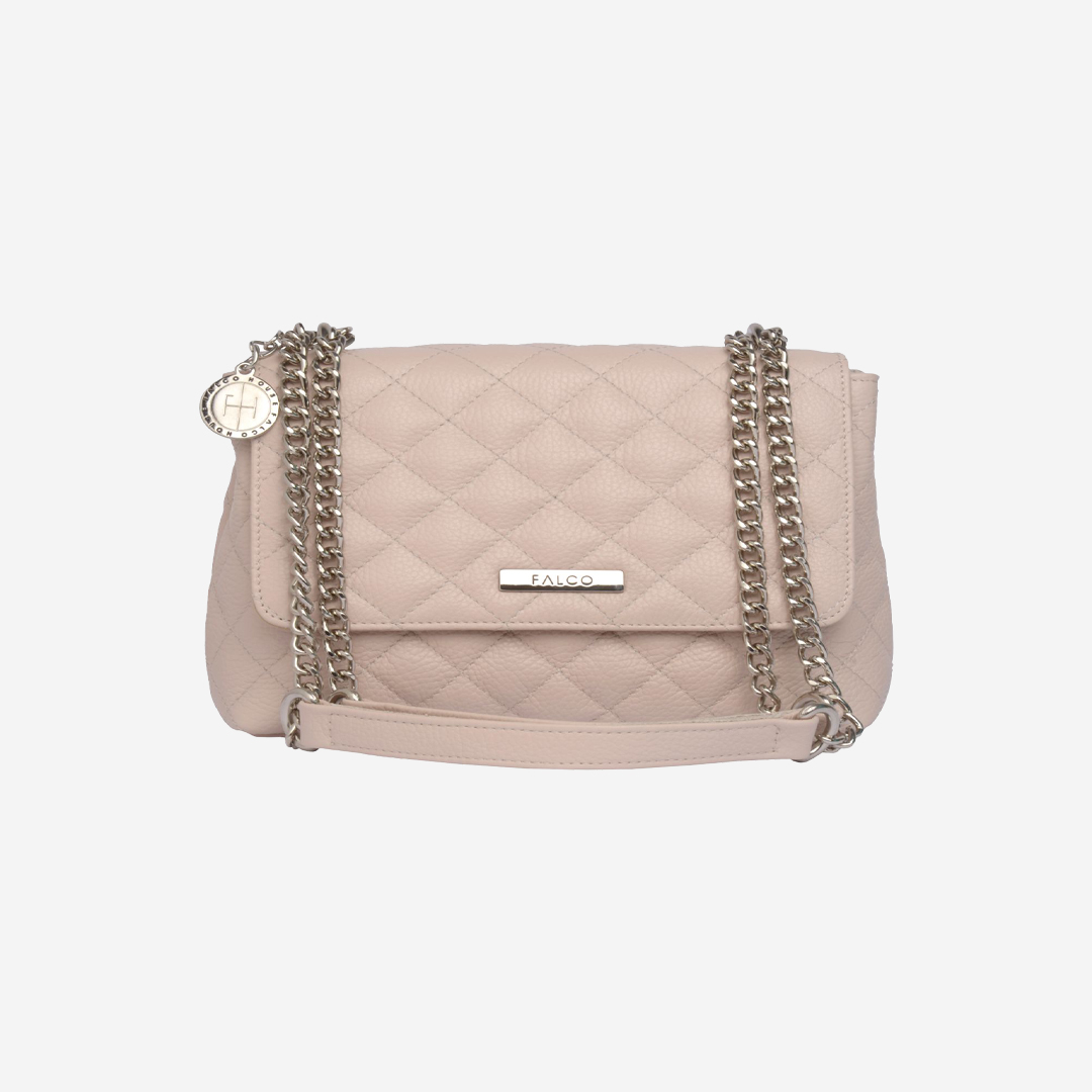 Štepana tašna izrađena od kvalitetne prirodne kože. Veoma je praktična, sa dovoljno mesta za najosnovnije. Ima dugačak metalni lanac sa kožnim dodatkom za ugodno nošenje. Lanac je podesiv na dve veličine. Izgled tašne je upotpunjen metalnom brendiranom alkom Falco.