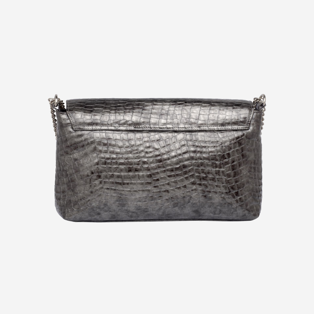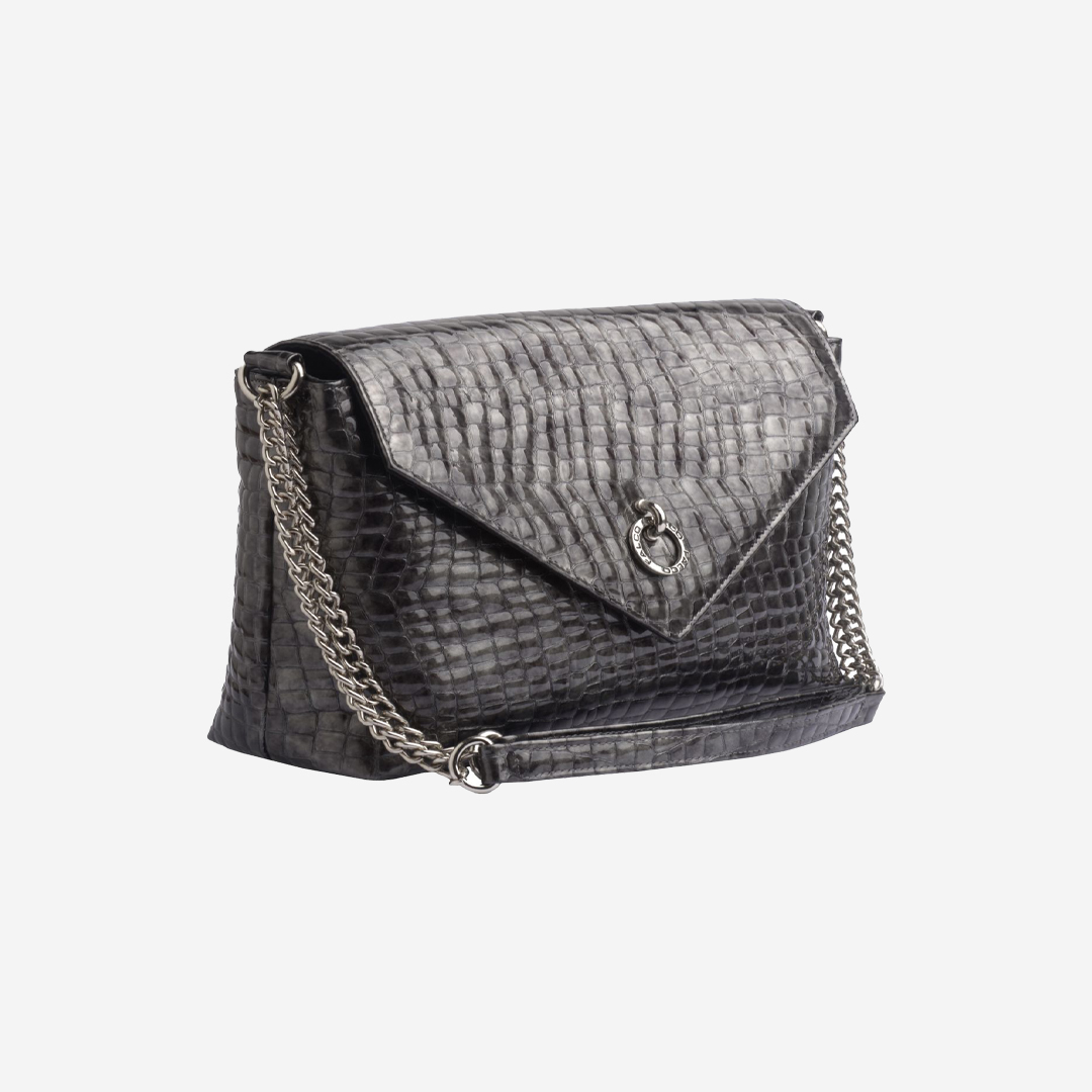 Trendy ženska tašna izrađena od kvalitetne prirodne kože. Unutrašnjost je veoma je praktična sa velikom pregradom i džepom. Ima dugačak metalni lanac sa kožnim dodatkom za ugodno nošenje. Lanac je podesiv na dve veličine. Izgled tašne je upotpunjen metalnom brendiranom alkom Falco.