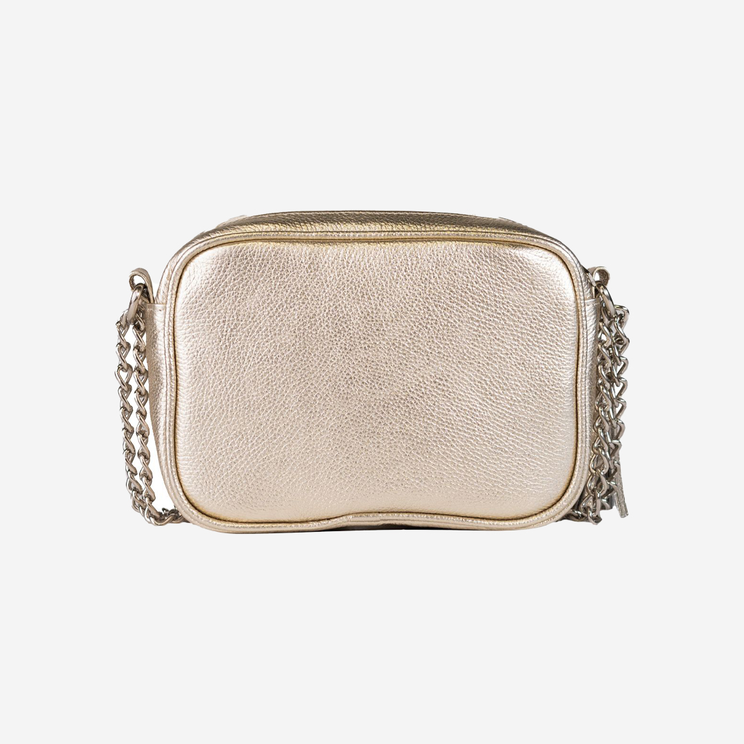 Štepana tašna izrađena od kvalitetne prirodne kože. Veoma je praktična, sa dovoljno mesta za najosnovnije. Ima dugačak metalni lanac sa kožnim dodatkom za ugodno nošenje. Lanac je podesiv na dve veličine. Izgled tašne je upotpunjen metalnom brendiranom alkom Falco.