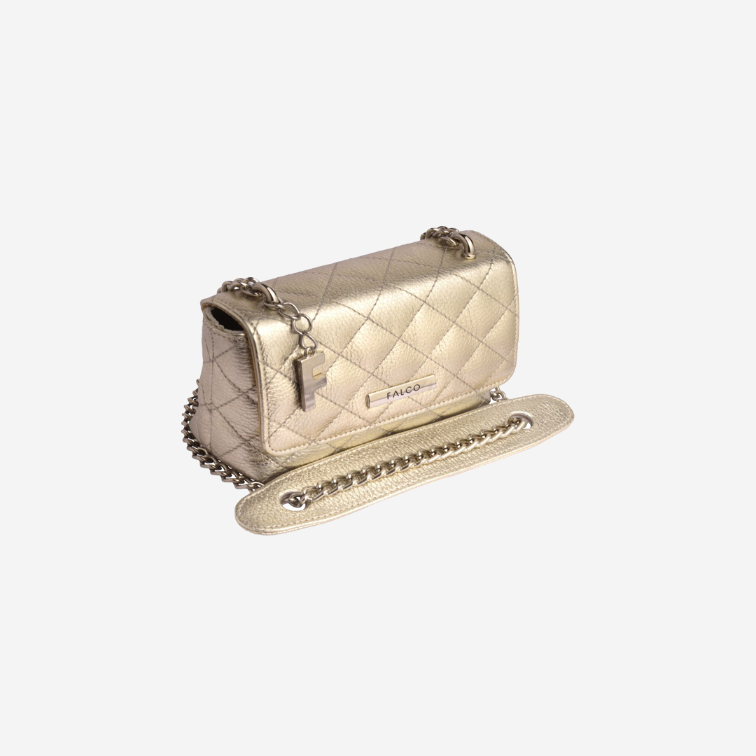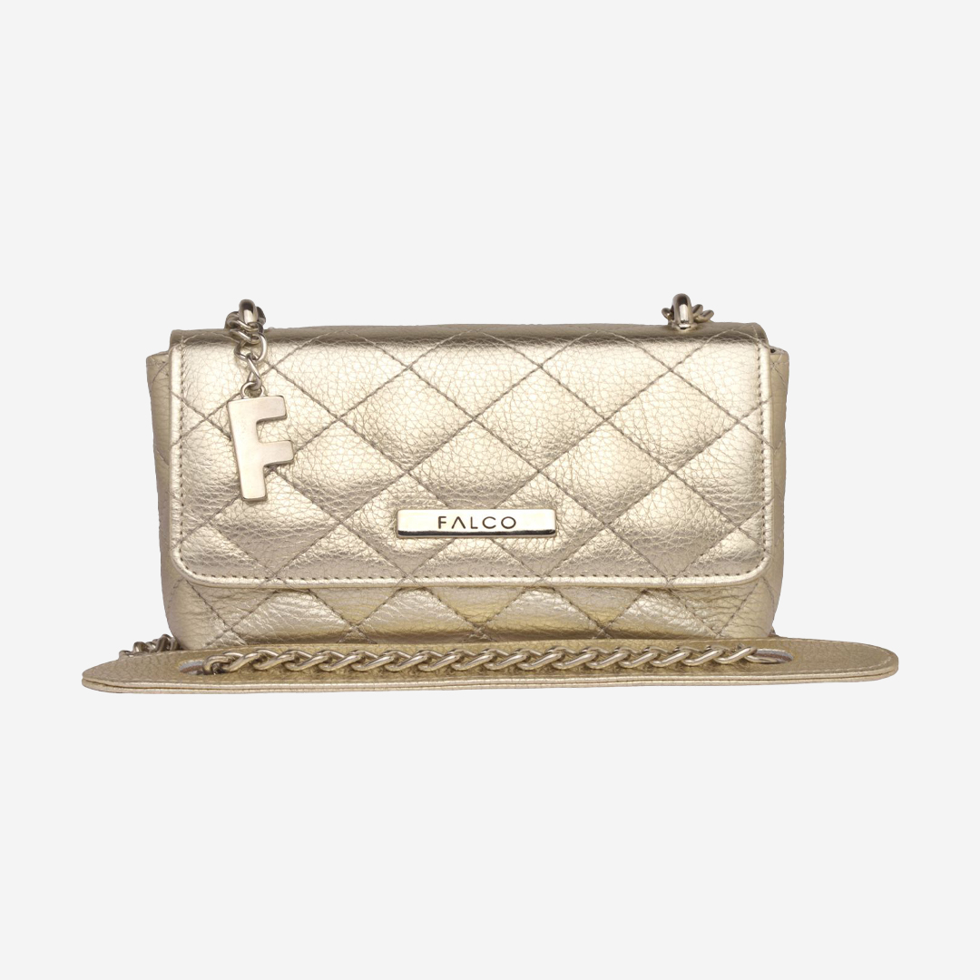 Štepana tašna izrađena od kvalitetne prirodne kože. Veoma je praktična, sa dovoljno mesta za najosnovnije. Ima dugačak metalni lanac sa kožnim dodatkom za ugodno nošenje. Izgled tašne je upotpunjen metalnom brendiranom alkom Falco.