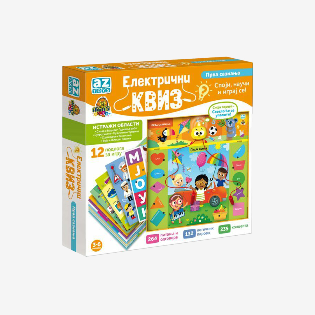 Zabava i učenje idu ruku pod ruku uz Električni kviz, interaktivnu edukativnu igru osmišljenu za decu uzrasta od 3 do 6 godina. Kroz zanimljive zadatke i kviz pitanja, mališani razvijaju logičko razmišljanje, pamćenje, pažnju i veštine povezivanja, dok istovremeno stiču nova znanja o svetu oko sebe.