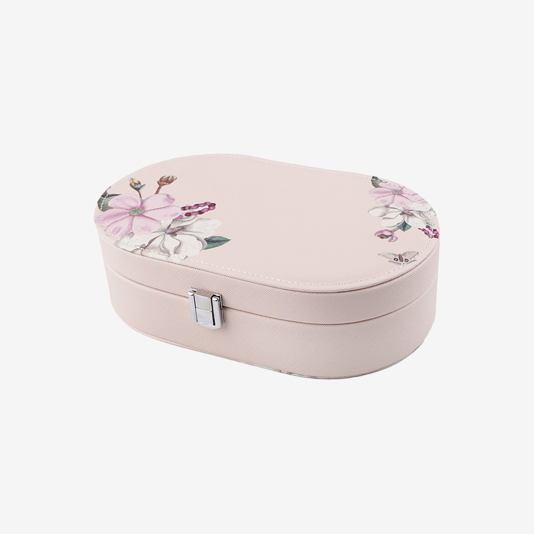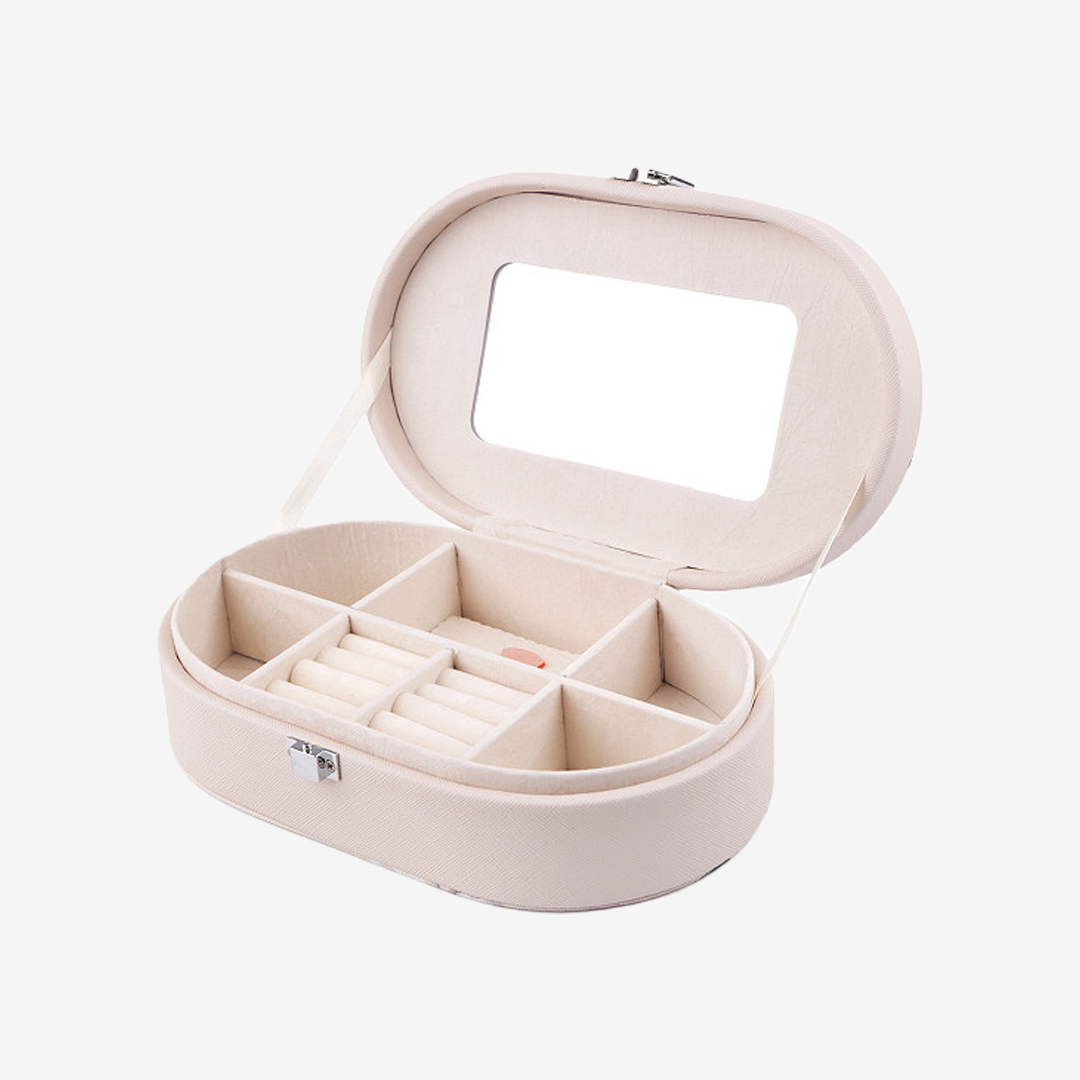 Elegantna ovalna kutija za nakit u svetloj bež nijansi, idealna za organizaciju i čuvanje omiljenih komada. Poklopac sadrži ogledalo, dok unutrašnjost nudi više funkcionalnih pregrada.