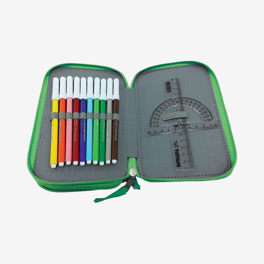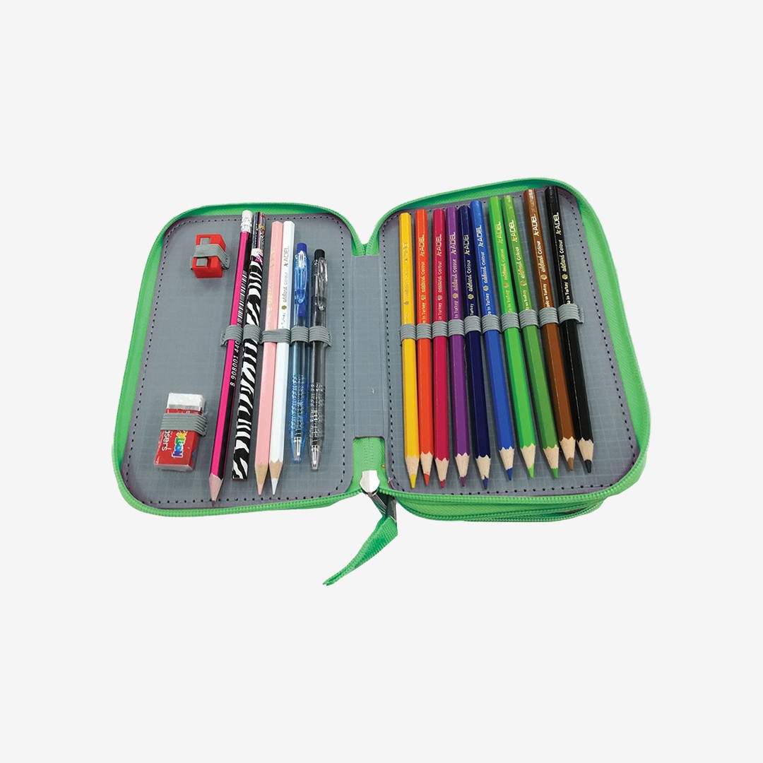 Sadržaj pernice: 12 bojica, 10 flomastera, 2 hemijske olovke, 2 grafitne olovke, gumica, rezač, lenjir i uglomer.
