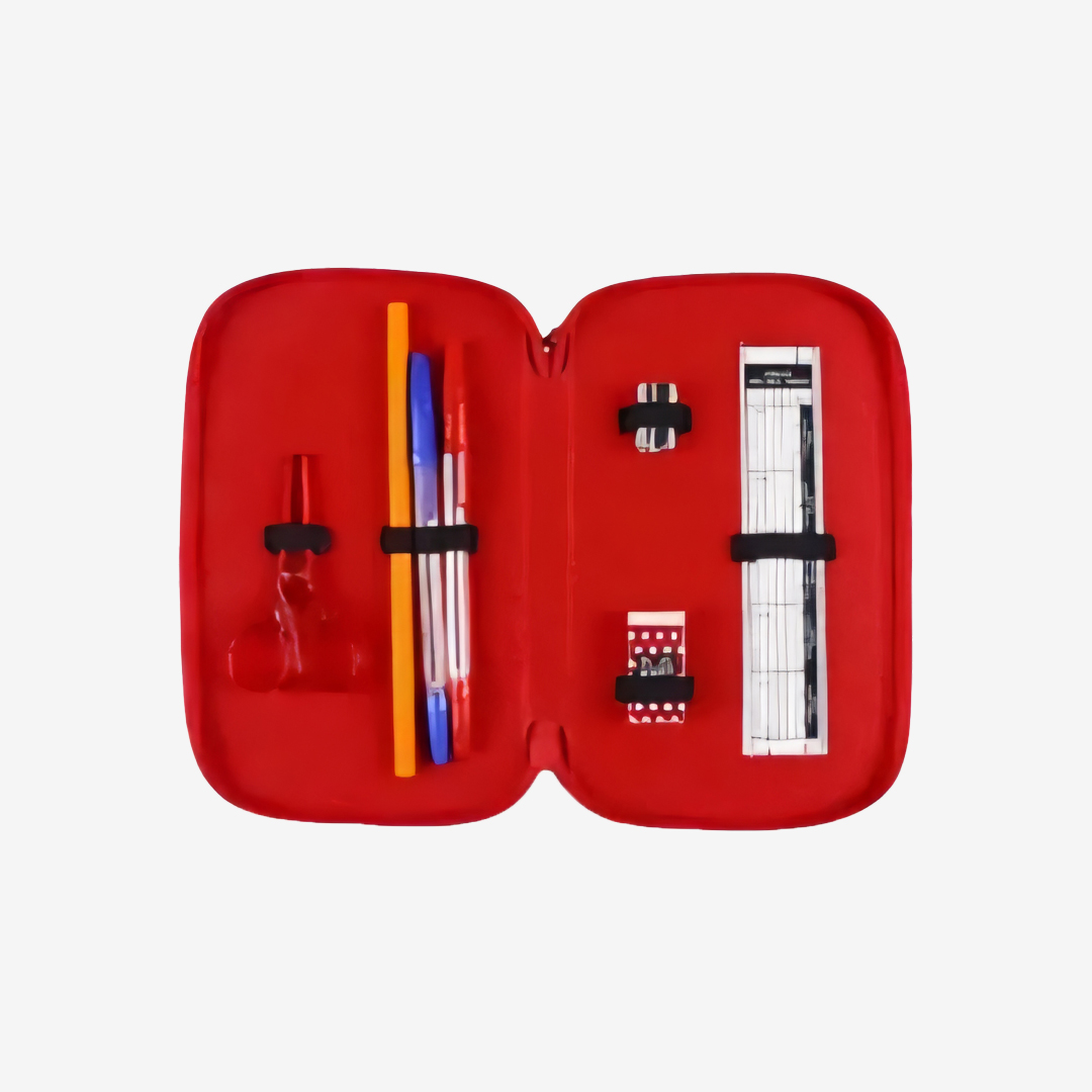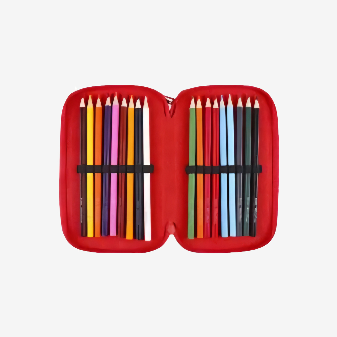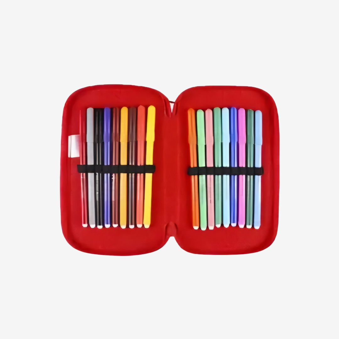 Trodelna puna pernica sadrži 18 bojica, 18 flomastera, 2 hemijske olovke, gumicu, makazice, raspored časova i rezač. Izrađena je od poliestera 100%.