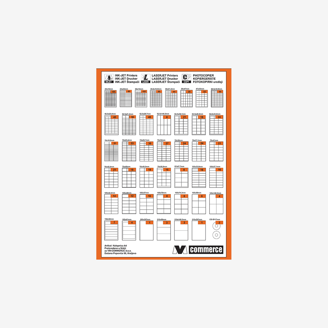 Samolepljive nalepnice na A4 listu. Pogodne za kancelarijske i kućne poslove. Na jednom A4 listu ima 40nalepnica, a u pakovanju dolazi 100 A4 listova.