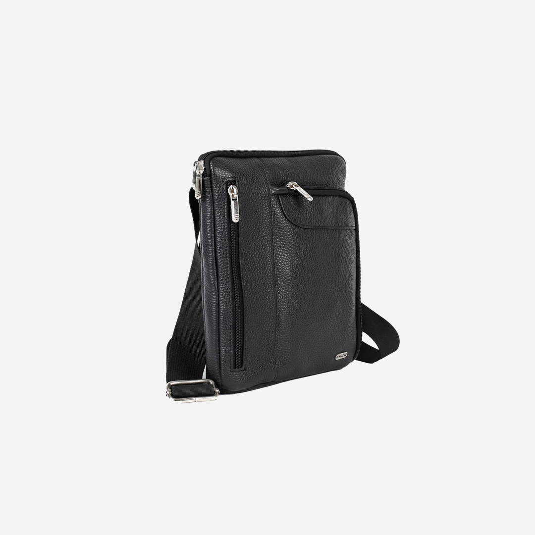 Biznis muška torbica izrađena od kvalitetne prirodne kože u crnoj boji. Ima praktičnu unutrašnjost sa dva komotna džepa. Sa spoljne strane se nalaze dva džepa sa cipom, kao i džep sa cipom sa zadnje strane. Ima dugački podesivi grif. Izgled torbice je upotpunjen metalnom pločicom Falco.