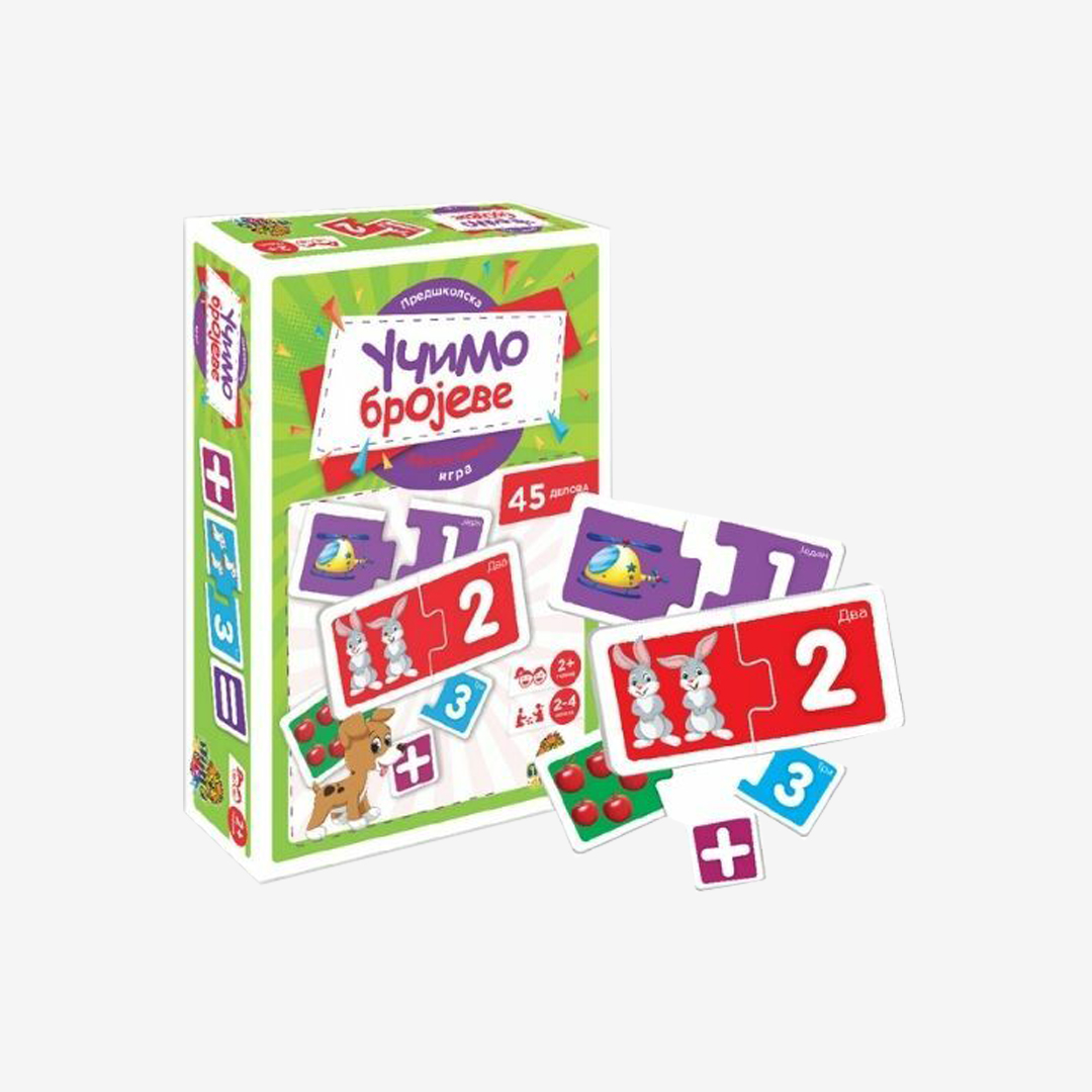 UČIMO BROJEVE je zabavna i poučna slagalica namenjena najmlađima, osmišljena da deci na jednostavan i zanimljiv način približi svet brojeva. Set sadrži dupli špil slagalica sa brojevima od 1 do 10, pri čemu svaka brojčana kartica ima svoj slikovni par koji prikazuje odgovarajući broj predmeta, kao i pet dodatnih kartica sa jednostavnim matematičkim zadacima.