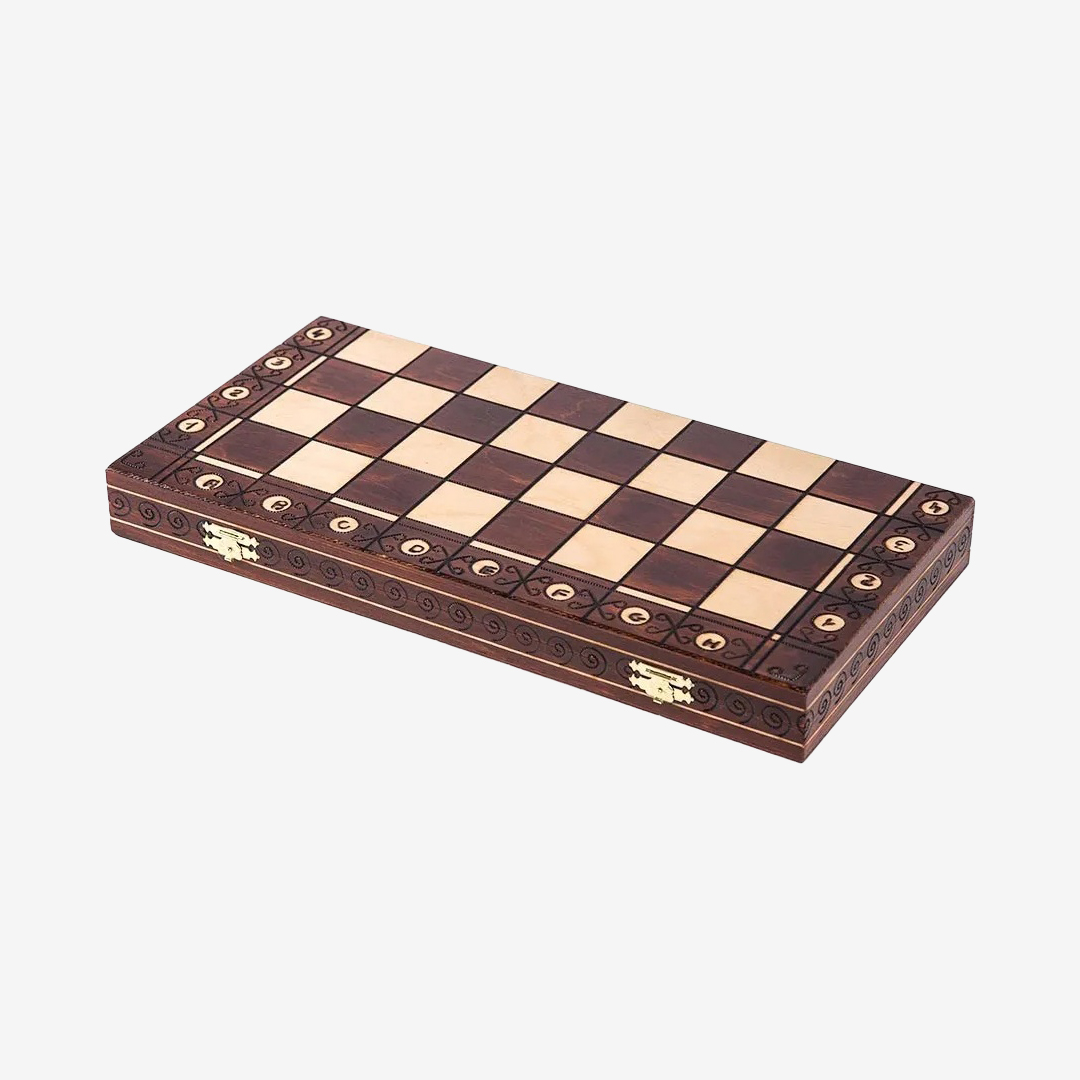 Elegantan šahovski set izrađen od visokokvalitetnog drveta sa urezanom šahovskom tablom i figurama. Donji deo svake figure poseduje metalne utege koji obezbeđuju savršenu stabilnost tokom igre.