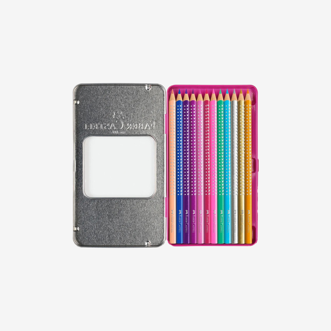 Set Sparkle drvenih bojica od 12 komada donosi sjajne boje i atraktivan dizajn koji će oduševiti najmlađe. Svaka bojica ukrašena je dekorativnim šljokičastim tačkicama, dok se komplet isporučuje u kvalitetnoj metalnoj kutiji sa prozorčićem i cvetnim dezenom u popularnoj roze boji – idealnoj za poklon ili praktično odlaganje.