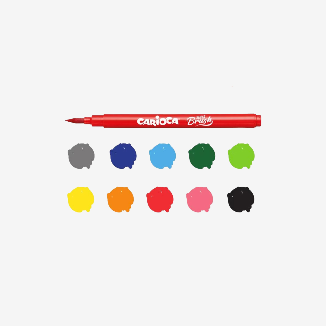 Carioca Super Brush flomasteri predstavljaju svestran komplet koji donosi 10 intenzivnih boja idealnih za školu, kreativne projekte i hobi aktivnosti. Svaki flomaster poseduje meki i fleksibilni vrh u obliku četkice, što omogućava širok spektar poteza – od finih linija do širokih, slikarskih tragova.